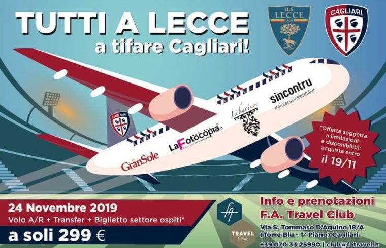 Alla fine il prezzo complessivo della trasferta, organizzata dallโagenzia di viaggi FATravel, รจ di 299 euro: comprende volo di andata e ritorno Cagliari-Brindisi, trasferimento in bus โ sempre andata e ritorno โ tra Brindisi e Lecce piรน il prezzo del biglietto allo stadio. Insomma, Cagliari si prepara allโesodo di massa per seguire la squadra di Maran: “Lโidea di portare parte della Sardegna in trasferta in questo momento magico รจ qualcosa di speciale. โ continua Andrea โย Per questo nessuno da questa iniziativa sta guadagnando un euro. Si tratta di un gesto di amore per la squadra, doveroso perchรฉ mai come questโanno i calciatori rappresentano la cittร e tutta la regione”. E per dare la possibilitร non solo ai cagliaritani ma a tutti i sardi di fare i biglietti in maniera semplice per la trasferta a Lecce la FA Travel ha creato un’apposita pagina web dove caricare il proprio documento online e comprare cosรฌ anche il biglietto dello stadio comodamente da casa.ย
