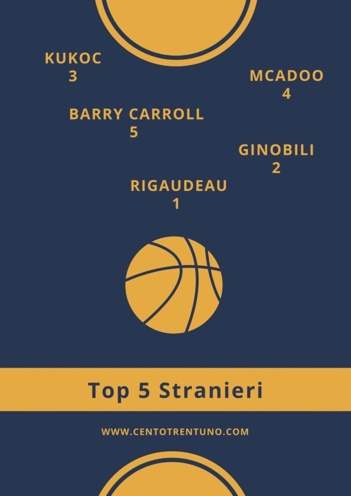 Top 5 stranieri: Due maglie delle V Nere caratterizzano gli esterni del quintetto della squadra straniera: in cabina di regia il francese Antoine Rigaudeau, bandiera e punto di riferimento di una straordinaria Virtus che conquistò tutto (comprese due Eurolega a cavallo tra i ’90 e i primissimi del 2000) prima di varcare l’oceano per una sfortunata esperienza in NBA con i Dallas Mavericks. Tutt’altro che negativi gli anni in Texas del “Narigon” Manu Ginobili, cresciuto esponenzialmente sotto l’ala protettrice del transalpino prima della chiamata negli Spurs con cui ha vinto 4 anelli. Il ragazzo di Bahia Blanca è diventato grande proprio nel nostro campionato tra Reggio Calabria e Bologna. Il suo nome è riemerso nel grande pubblico recentemente dopo il successo di Last Dance: c’era anche Tony Kukoc tra quei Chicago Bulls di sua maestà Michael Jordan. L’Airone di Spalato fece la sua prima esperienza internazionale con la Benetton Treviso, vincendo lo Scudetto del 1991-1992 e la Coppa Italia del 1993 prima di volare nell’Illnois. Scarpette rosse per i lunghi del nostro quintetto, entrambi con un passato in NBA abbastanza importante: il centro Joe Barry Carroll nel suo unico anno a Milano vinse uno Scudetto e una Coppa Korac, prima di passare un’ideale testimone al mitico Bob McAdoo che sollevò due coppe dei campioni, due titoli e una Coppa Italia con la maglia della Phillips per poi giocare a fine carriera anche con Forlì e Fabriano.