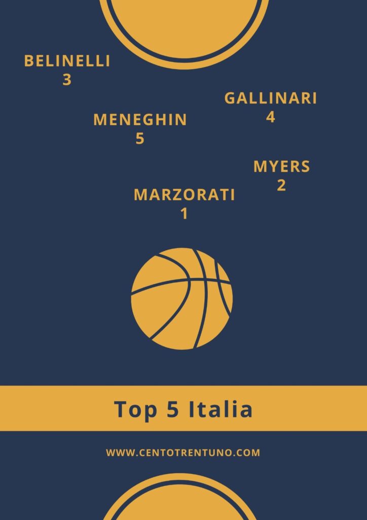 Top 5 Italia: Gli unici due titoli europei conquistati dall’Italia, entrambi conquistati in terra francese, accomunano gli esterni del nostro quintetto: nel 1983 era la bandiera di Cantù Pierluigi Marzorati a “portare palla” e smazzare assist ai compagni di Nazionale, ma soprattutto davanti a un pubblico unico in Italia come quello di Cantù che festeggiò due Scudetti e due coppe dei campioni con l’ingegnere volante in quintetto. Giocatore dalle caratteristiche diverse è stato invece Carlton Myers, colui che detiene ancora il record di punti in una partita professionistica italiana con 87 mattoncini nella vittoria di Rimini contro Udine. L’epoca d’oro l’istrionica guardia la visse alla Fortitudo, maglia con la quale conquistò lo Scudetto nel 1999-2000; per lui una chiamata in NBA dai New York Knick non raccolta nel 1994. Campionato americano di cui è ormai un habitué Marco Belinelli, unico italiano a vincere un anello con i San Antonio Spurs e una gara di tiro da 3 all’All Star Game. Nove le maglie vestite nel suo periodo in America per il ragazzo di San Giovanni in Persiceto che in gioventù è passato da una sponda bolognese all’altra. L’ala forte è un’altra realtà tricolore in NBA, Danilo Gallinari: figlio d’arte, al Gallo sono bastate appena due stagioni da giovanissimo all’Olimpia Milano per guadagnarsi la chiamata al draft. Il centro italiano non poteva che essere Dino Meneghin, leggenda del basket italiano e padre di quell’Andrea che ha conquistato un magico titolo col “Poz” in quella pazza Varese, nonché l’oro agli Europei del 1999. Papà Dino è stato senza dubbio il miglior centro italiano di sempre, autentica roccia nel pitturato e dotato di una buona tecnica: quattro decadi nell’eccellenza della pallacanestro italiana fino al ritiro nel 1994 in maglia Olimpia Milano, quella con cui ha raccolto insieme a quella di Varese i suoi titoli più importanti.