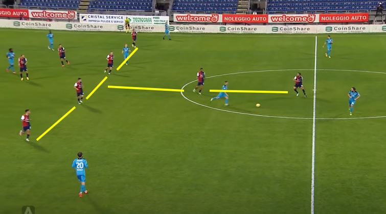 Tempi di gioco – La scelta di partire con Ounas e Sottil ai lati di Joao Pedro e Pavoletti non ha prodotto per 45 minuti gli effetti sperati. Più concentrati nel lavoro difensivo comunque qualitativamente non eccelso, hanno perso via via la pericolosità offensiva oltre a un eccessivo individualismo che ha tolto alla squadra i tempi di gioco soprattutto dal lato dell’algerino. Zappa ha patito l’assenza di Nández, Ounas ha sì mostrato qualità ma quasi sempre fine a se stesse se non limitanti come quando ha ignorato Pavoletti.