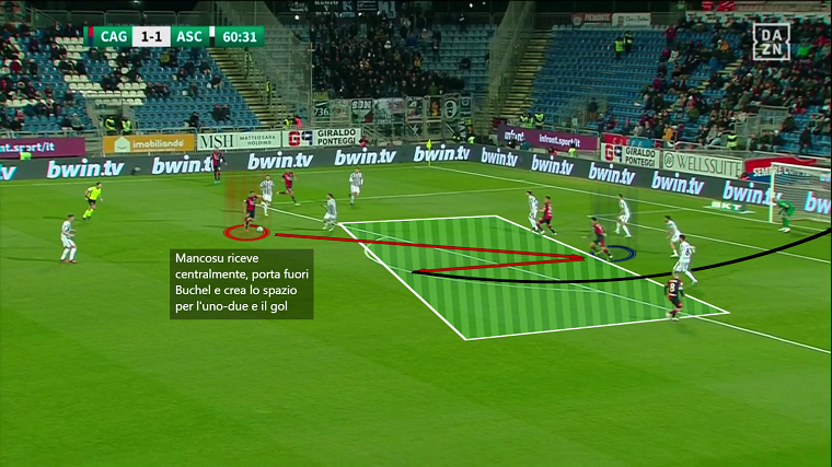 Come segnalato in precedenza, anche la nuova posizione di Mancosu può fare la differenza per risolvere il problema della sterilità offensiva. Non più seconda punta, ma vero numero 10 dietro i due centravanti. Il primo a beneficiare di questo cambiamento è proprio il centrocampista sardo che per caratteristiche è in grado di svolgere alla perfezione i compiti del trequartista nel 4-3-1-2, ossia legare i reparti, muoversi con assoluta libertà tra le linee sfruttando la presenza delle due punte che abbassano la retroguardia avversaria, allargarsi a piacimento per creare superiorità numerica sulle fasce con la consapevolezza che Lapadula non rimarrà isolato in area, avere più spazio per combinare con i compagni e andare alla conclusione da lontano. L’azione che porta al rigore e il gol del 2-1 sono degli ottimi esempi di quanto detto.