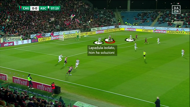 Il Cagliari di Ranieri nella maggior parte dei casi gioca lungo con il portiere: se l’unico riferimento offensivo è Lapadula è facile per gli avversari riconquistare il pallone. Pur se molto bravo nel tenere alle spalle l’avversario e difendere il pallone quando riceve sulla figura, sui duelli aerei spesso fa fatica essendo mediamente più basso dei centrali avversari. Anche quando riesce a spizzare il pallone, manca poi un altro riferimento offensivo che occupi i difensori e permetta ai centrocampisti rossoblù di vincere la seconda palla. In più, aspetto di fondamentale importanza, proprio le seconde palle possono diventare preda di un trequartista se oltre a una spalla in attacco si inserisce un giocatore come Mancosu alle loro spalle. Con una punta fisica in più, come è logico, è più facile sia vincere il duello aereo che prendere possesso del pallone quando torna a terra sfruttando la presenza di Lapadula; con un trequartista la mediana e il reparto offensivo si legano maggiormente e oltre alla soluzione lunga si possono trovare spazi anche con scambi sul breve.
