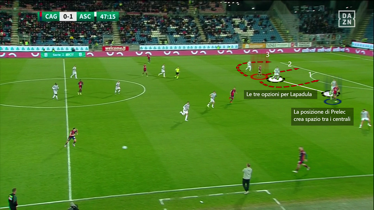 Guardando la partita con una prospettiva più analitica, si può notare come il miglioramento di Lapadula nella ripresa abbia molto a che fare con l’inserimento di Nik Prelec e il conseguente arretramento di Mancosu nella posizione di trequartista puro. Giocare con un attaccante in più, specialmente uno che si impegna tanto in fase di non possesso e che è a suo agio nei duelli corpo a corpo e nel venire incontro per giocare con i compagni, permette all’italo-peruviano di avere più spazio dentro l’area e focalizzarsi maggiormente sul fare gol.