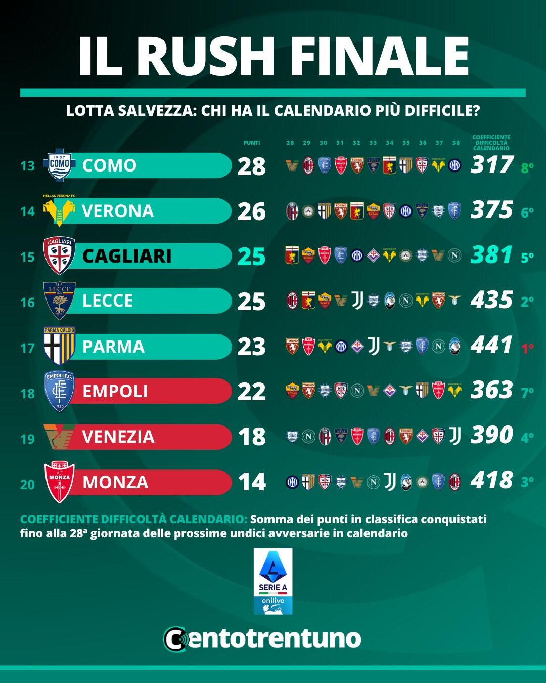 Utilizzando il criterio appena indicato la squadra con il calendario più favorevole sarebbe il Como, con una somma di punti delle avversarie di 317. Sei gare in casa (Venezia, Empoli, Torino, Genoa, Cagliari e Inter) e cinque in trasferta (Milan, Monza, Lecce, Parma e Verona), con l’arma a doppio taglio dei tanti scontri diretti in programma. Quello del Como è un caso particolare, perché sia come rosa che come gioco è considerata estranea alla lotta salvezza, ma di fatto con 28 punti è ancora pienamente coinvolta e, con diverse sfide contro concorrenti per la permanenza in Serie A, realisticamente a rischio, con quello che potrebbe essere un finale di tensione tra Cagliari in casa, Verona in trasferta e, infine, Inter in casa. Al secondo posto per calendario più “sereno” c’è l’Empoli, con un totale di 363 punti sommando la classifica attuale delle prossime undici avversarie (Roma, Cagliari, Venezia, Lazio, Parma e Verona in casa, Torino, Como, Napoli, Fiorentina e Monza in trasferta). I toscani sono assieme a Cagliari e Como tra le squadre che avranno di fronte le ultime due della Serie A, Monza e Venezia, mentre il Verona è l’unica delle sette sorelle che non ha in calendario né la sfida contro i brianzoli né quella contro gli uomini di Eusebio Di Francesco. Proprio il Verona è la terza nella speciale graduatoria che considera i punti totali delle avversarie nelle ultime undici giornate. È di 375 infatti la somma che risulta considerando le sei che andranno al Bentegodi (Bologna, Parma, Genoa, Cagliari, Lecce e Como) e le cinque che ospiteranno l’Hellas (Udinese, Torino, Roma, Inter e, all’ultima, Empoli). Detto del Cagliari, quarto con 381 punti sommati dalle avversarie fino a fine stagione, dietro i rossoblù c’è il Venezia con 390: sei gare al Penzo (Napoli, Bologna, Monza, Milan, Fiorentina e Juventus alla trentottesima) e cinque fuori casa (Como, Lecce, Empoli, Torino e Cagliari), con la particolarità di giocare quattro gare delle cinque lontano da Venezia contro dirette concorrenti, senza nessuno scontro diretto in Laguna. Chi sembra avere il calendario più complesso per distacco sono Lecce e Parma, con i salentini che troveranno avversarie che sommano a oggi 435 punti in classifica e i ducali ultimi con 441 punti. Per la squadra di Marco Giampaolo sei gare al Via del Mare (Milan, Roma, Venezia, Como, Napoli e Torino) e cinque fuori casa (Genoa, Juventus, Atalanta, Verona e Lazio) e ben quattro delle cinque in classifica da sfidare nelle ultime undici giornate, mentre per il Parma saranno cinque le partite al Tardini (Torino, Inter, Juventus, Como e Napoli) e sei quelle lontano dall’Emilia (Monza, Verona, Fiorentina, Lazio, Empoli e Atalanta), con una situazione ancora più complessa rispetto a quella del Lecce: tolto il Bologna, infatti, la squadra di Cristian Chivu troverà sulla propria strada sei delle prime sette in classifica, addirittura cinque su cinque considerando soltanto le primissime posizioni.