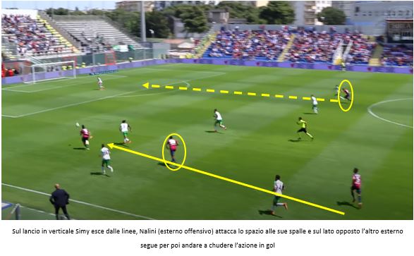 Infine l’attacco che quasi sempre nella carriera di Zenga è stato composto da tre elementi, un centravanti pivot e due finte ali a piede invertito pronte a tagliare verso il centro, esterni ai quali peraltro è richiesto anche un lavoro di copertura che porti la squadra a schierarsi con il 4-5-1 in fase di non possesso. Nel suo Crotone il ruolo di perno centrale fu svolto da Trotta e in alternativa da Budimir e Simy, quest’ultimo inserito soprattutto nel finale di stagione: tre giocatori fisici che il Cagliari non ha al momento, vista l’assenza di Pavoletti, centravanti che sarebbe stato perfetto per l’idea di gioco del Zenga calabrese. La ricerca del lancio lungo per la torre centrale e l’attacco delle seconde palle dei centrocampisti e delle spizzate da parte degli esterni d’attacco è un’alternativa difficilmente praticabile nella rosa rossoblù attuale, per questo sembrerebbe più facile vedere un Nainggolan da falso nove, pronto a uscire dalle linea per favorire i tagli dei due compagni d’attacco, o in alternativa usare uno tra Joao Pedro e Simeone come numero 9 rilanciando così Pereiro sulla destra per sfruttare le doti del suo sinistro.