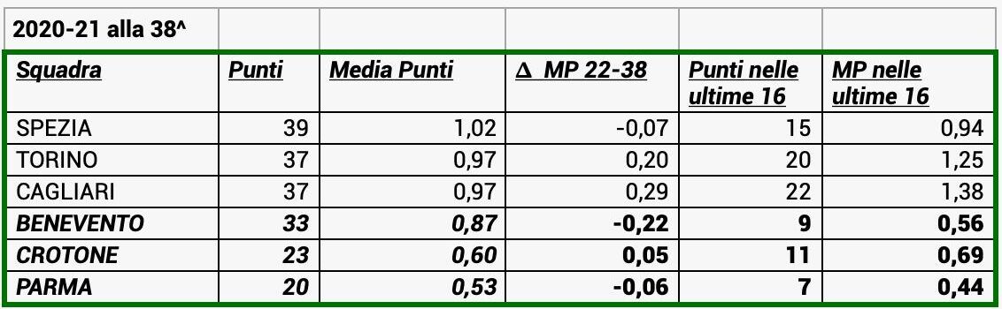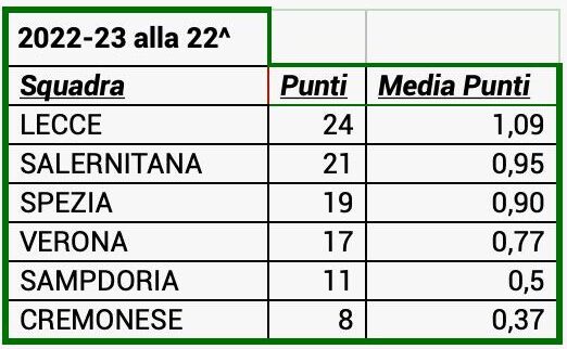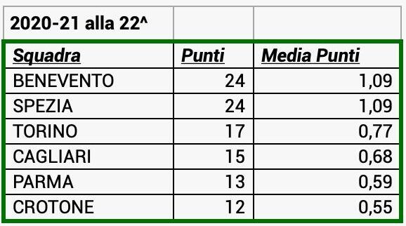 Ultima annata presa in esame è il 2020-21: alla 22^ giornata la situazione vedeva Benevento e Spezia a quota 24 punti, Torino 17, Cagliari 15, Parma 13 e Crotone 12.