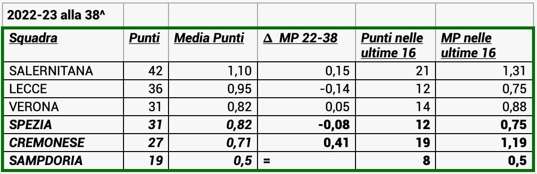 Al termine della stagione la classifica ha dato gli esiti indicati nella tabella sottostante, su tutti l’exploit della Salernitana capace di fare 21 punti nelle ultime 16 giornate, con una media parziale di 1,31 punti a partita. Inutile lo sprint della Cremonese con 19 punti, con una media di 1,19 punti per match, triplicata rispetto a quella delle prime 22 giornate (era 0,37). Interessante un altro dato: la media di 0,82 punti a partita di Verona e Spezia (entrambe a 31), ovvero le due squadre che si sono giocate la permanenza in Serie A con lo spareggio. Curiosamente la stessa media fatta segnare fin qui dal Cagliari di Ranieri.