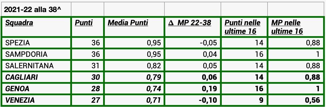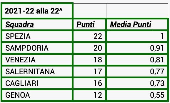Nel 2021-22, anno della retrocessione rossoblù con Mazzarri (più Semplici e Agostini) in panchina, alla 22^ giornata la classifica vedeva questa situazione: Spezia 22 punti, Sampdoria 20, Venezia 18, Salernitana 17, Cagliari 16 e Genoa 12.