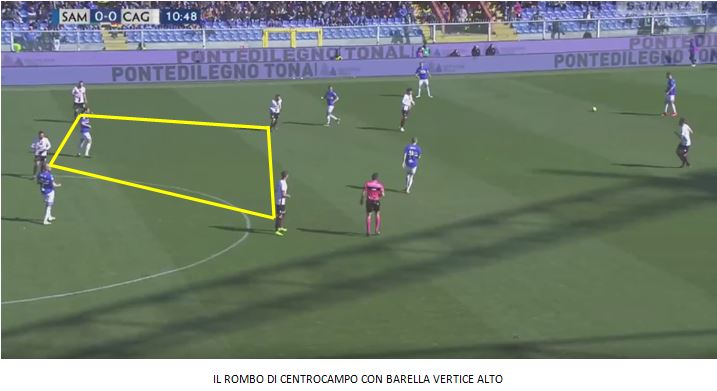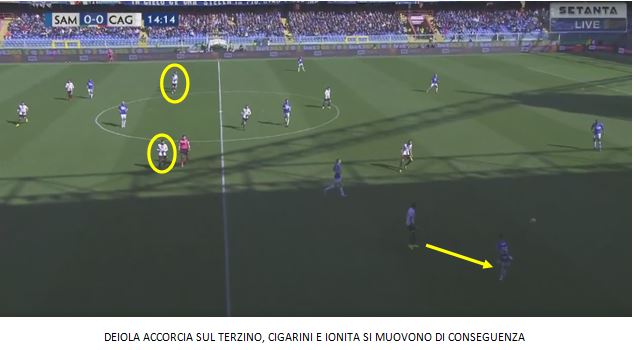 Lo schieramento ha così ricalcato quanto visto la settimana prima contro il Parma, con Cigarini in regia e Barella vertice alto fra le linee, mentre Ionita e Deiola hanno agito da scudieri del professore. Il lavoro delle due mezzali designate è stato molto importante in fase di pressione alta, soprattutto nel primo tempo, con il continuo accorciamento sui terzini e la chiusura delle linee di passaggio centrali.