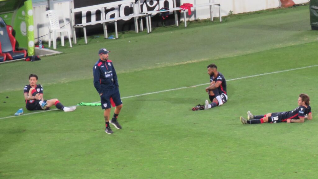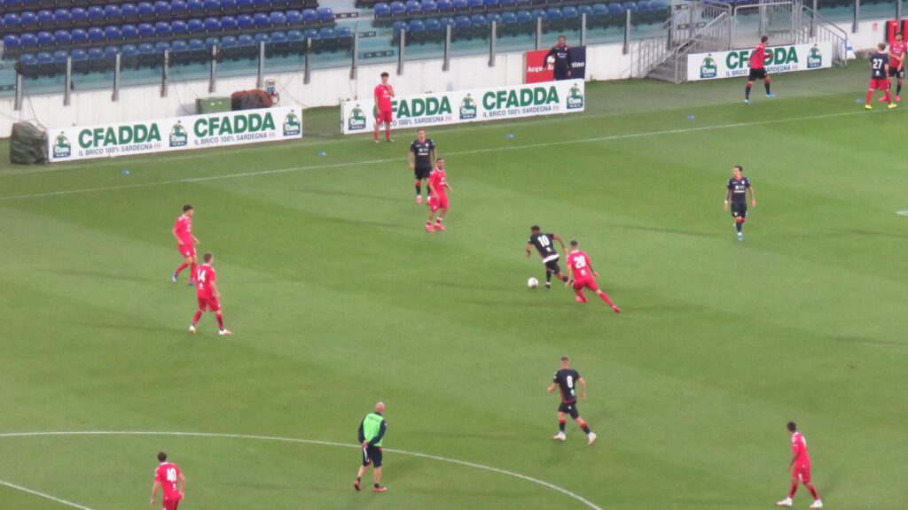Nell’allenamento serale – per abituarsi agli orari delle prossime gare – svolto dal Cagliari alla Sardegna Arena, grande spazio alla partitella: blu contro rossi, con un 3-5-2 speculare o quasi. Da una parte Olsen tra i pali, linea difensiva composta da Cacciatore, Ceppitelli e Pisacane; sugli esterni Lykogiannis a sinistra e Nandez a destra, con Cigarini al centro insieme a Rog e Ionita, con Simeone e Joao Pedro in avanti. Stesso schieramento per i Rossi, con Cragno in porta, linea a tre composta da Klavan al centro, Walukiewicz a destra e Carboni a sinistra, Ladinetti play basso, Birsa e Oliva ai suoi fianchi, con i quinti Mattiello a destra e Pellegrini a sinistra. Davanti la coppia Paloschi-Ragatzu, prima dei cambi decisi dall’Uomo Ragno: Pereiro ha rilevato l’ex Spal, mentre Lombardi ha preso il posto di Ladinetti, con Birsa che si è spostato in cabina di regia.