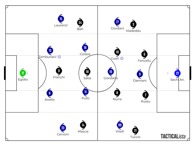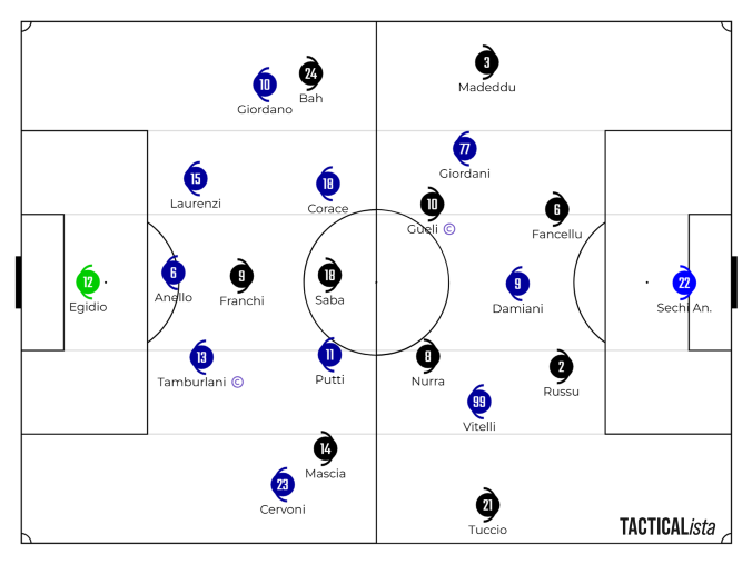 Il trio difensivo è composto da Anello, Tamburlani e Laurenzi, che stringe la posizione; sulla corsia di sinistra come quinto viene sacrificato proprio Giordano, che nella prima mezz’ora fatica tantissimo in mezzo al campo, e in questo modo sono Giordani e Vitelli a supportare l’unica punta Damiani: