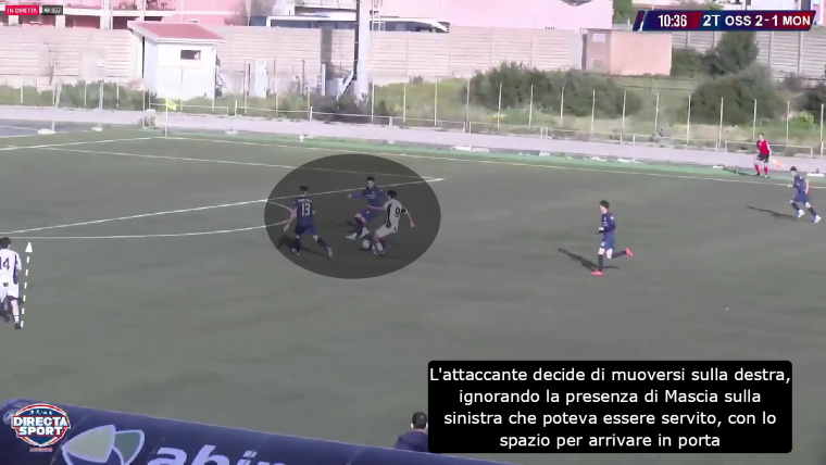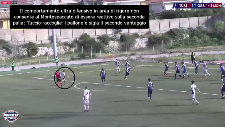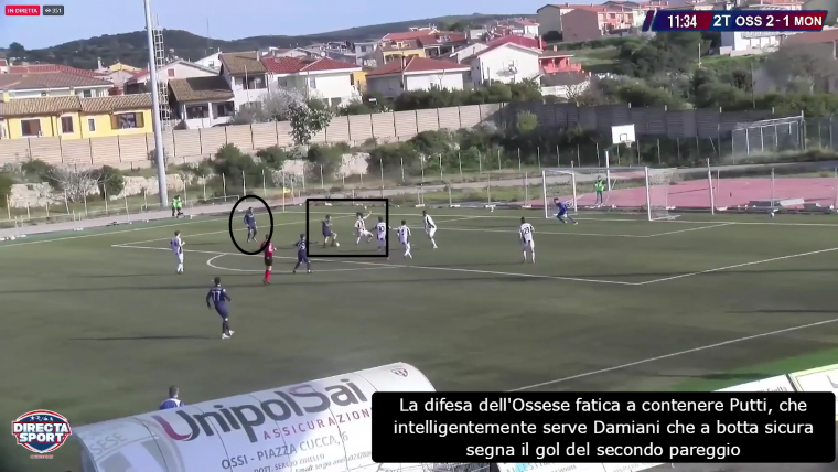 Sono due le armi che hanno consentito al Montespaccato di rimanere sempre in partita: la prima porta il nome di Alessio Damiani, autore dei due gol. L’attaccante ex W3 Maccarese ha fatto reparto da solo, facendo a sportellate con i difensori di casa e la sua capacità di attacco dell’area è stata letale. Come nel caso del primo pareggio: l’Ossese perde sulla trequarti un facile pallone, recuperato pochi secondi prima; lo smarcamento di Damiani è dietro la linea difensiva, scaglionata non correttamente e orientata completamente su palla. Diventa quindi facile per l’attaccante battere a colpo sicuro Sechi: