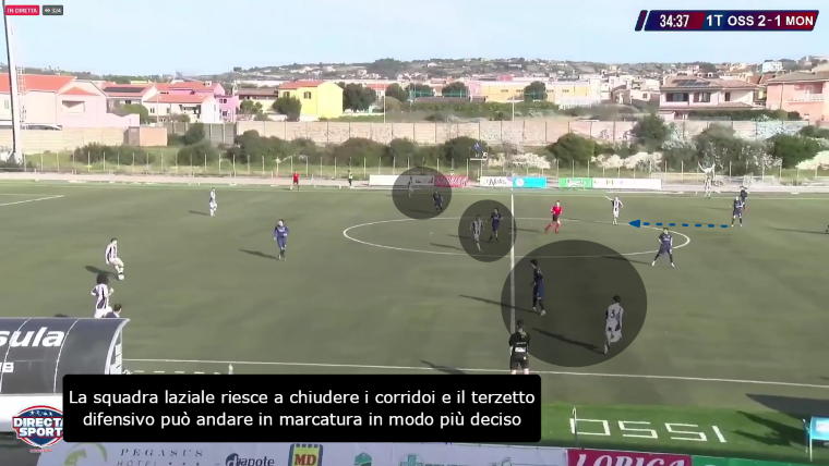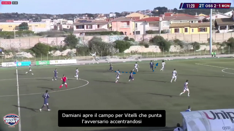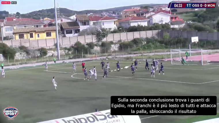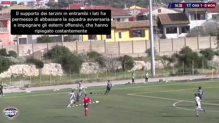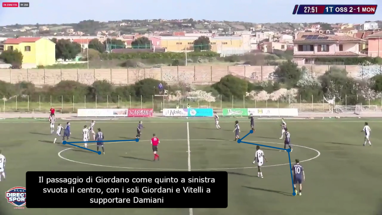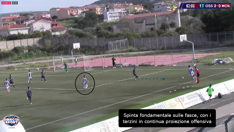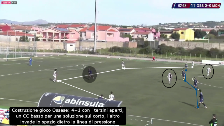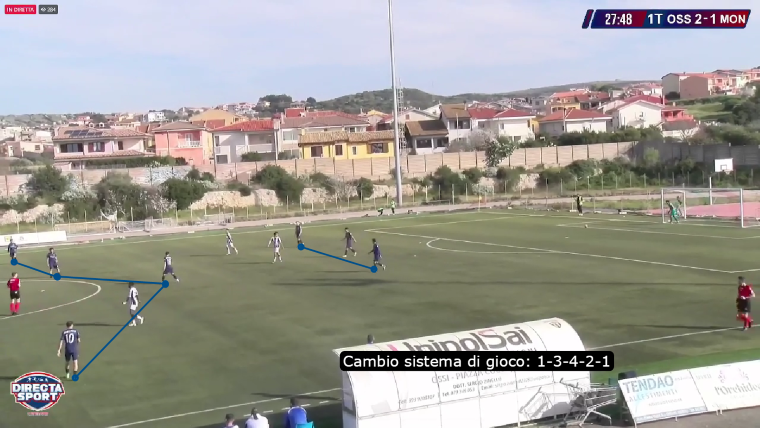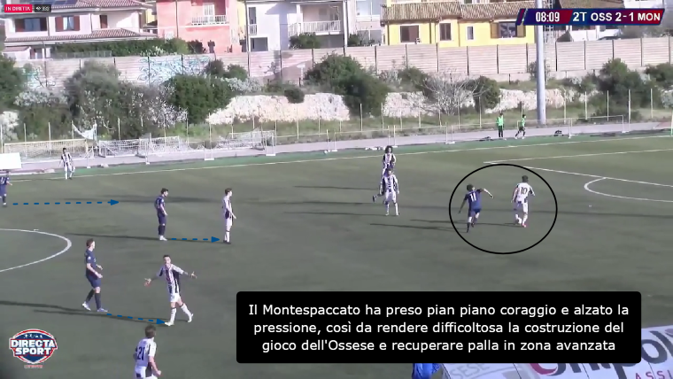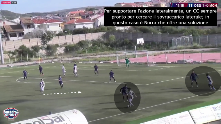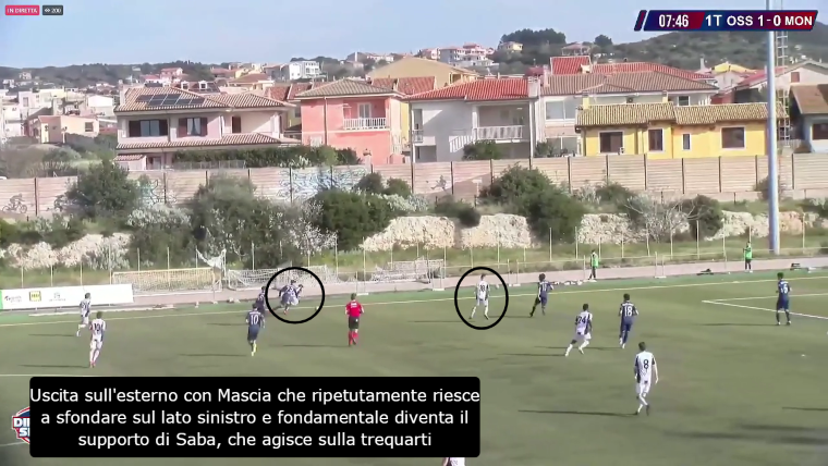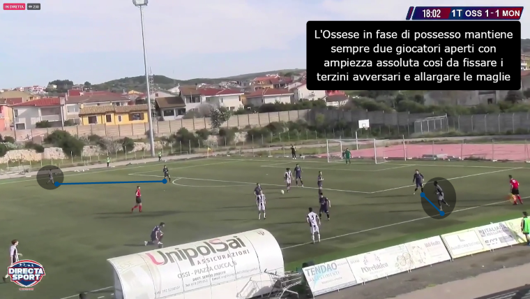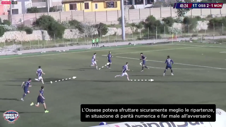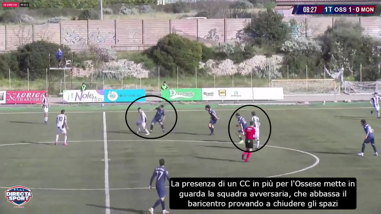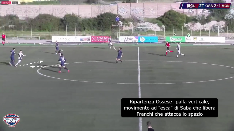 La presenza contemporanea di Saba, Gueli e Nurra ha dato all’Ossese l’imprevedibilità necessaria per condurre il gioco: nella gara d’andata, il doppio centravanti era risultata una mossa azzardata, con Villa e Franchi troppo statici e facilmente marcabili. La presenza di un trequarti e un Franchi mobile ha consentito alla formazione bianconera di essere imprevedibile, in costruzione gioco ma anche negli sviluppi nel terzo centrale di campo. Un esempio sulla costruzione del gioco: Ossese che cerca sempre la partenza palla al piede con una costruzione 4+1: i 4 difensori e il mediano, funzione che veniva presa da