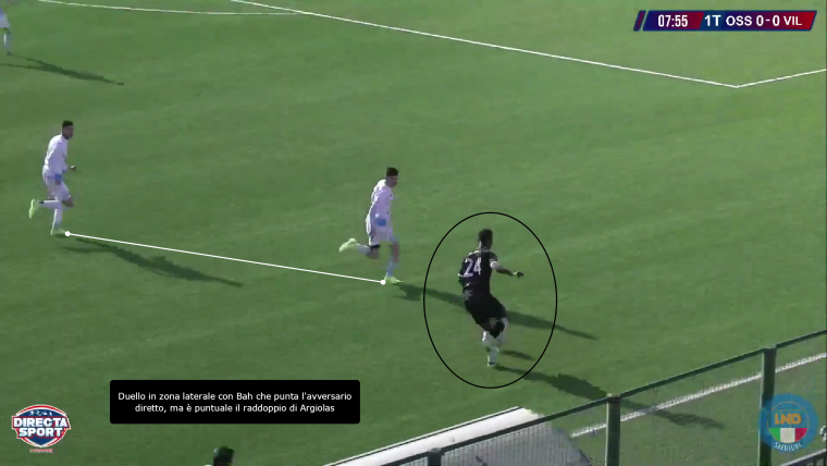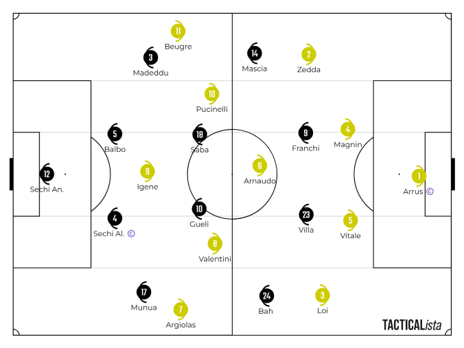 Ecco quindi la contrapposizione: Ossese che si ritrova a dover affrontare un 3 contro 2 in mezzo al campo ma al tempo stesso può creare una situazione di superiorità numerica in avanti, con il duo difensivo Sechi-Balbo a controllare Igene; l’ago della bilancia sono però le corsie esterne, dove si possono sviluppare i duelli in 1 contro 1 e 2 contro 2, in cui i difensori laterali devono affrontare esterni di corsa e qualità palla al piede.