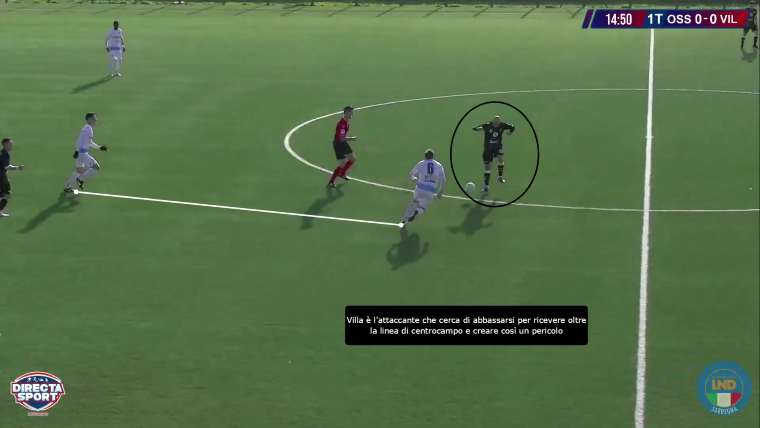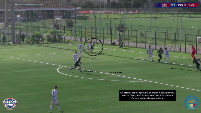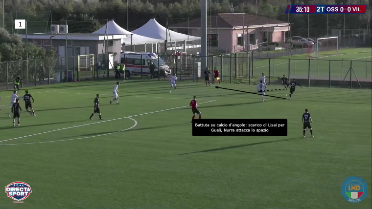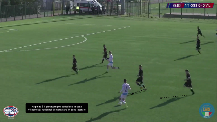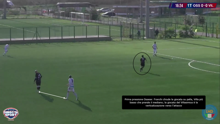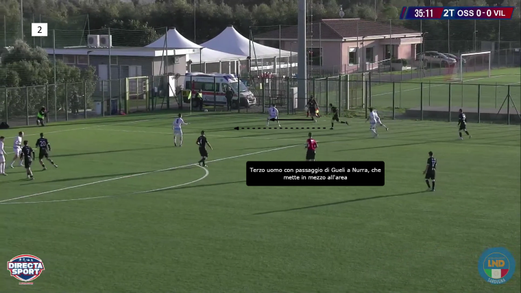 Villa è il giocatore che si abbassa per ricevere palla in zona di rifinitura e creare una palla aperta, che permetta l’attacco alla linea avversaria creando così dei pericoli alla porta del Villasimius. D’altra parte, la squadra di Manunza cerca direttamente la giocata profonda verso l’attacco, dove Igene, in particolare, è bravo di testa e a mantenere il possesso. L’Ossese risponde muovendo Franchi tra i centrali e abbassando Villa nella mediana, posizione in cui viene cercato poco: