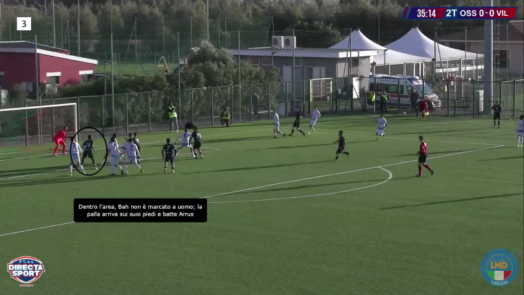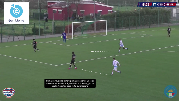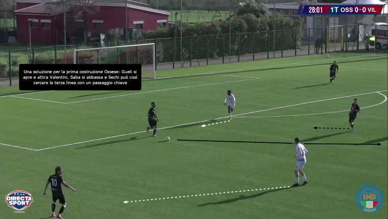 La prima pressione del Villasimius è ben definita: Igene si muove per chiudere in primo luogo la giocata di ritorno verso il portiere o il centrale opposto e poi arriva alla pressione del portatore; Valentini, dei 3 centrocampisti, è invece il giocatore che si stacca per prendere il mediano. Questa contrapposizione non permette, soprattutto a inizio gara, una gestione pulita del possesso da parte dell’Ossese, tanto che per i primi 15 minuti non riesce a uscire dalla metà campo. Ma la squadra di Demartis è tatticamente intelligente: Gueli e Saba, infatti, cercano di aprire il centrocampo avversario, creando i presupposti per la ricerca della terza linea, ovvero quella degli attaccanti con dei passaggi chiave: