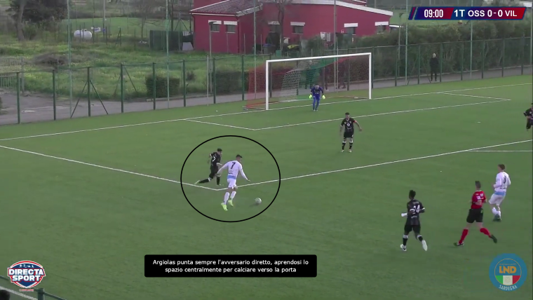 I duelli sono la parte più interessante e fondamentale del calcio: se vinci un duello individuale hai più possibilità di portare un attacco alla porta avversaria. Nella gara analizzata, è chiara la ricerca del Villasimius del giocatore più importante della squadra, ovvero Matteo Argiolas, che quando è nelle migliori condizioni è devastante: tanti sviluppi nella zona sinistra, dove l’ex Ferrini ha puntato più volte Munua, convergendo verso il centro e tentando il tiro verso lo specchio: