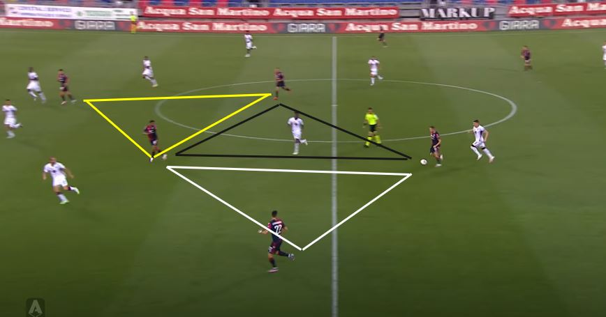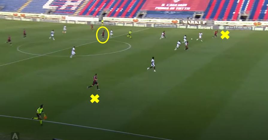 Infine l’uso dei due difensori centrali ai lati di Ceppitelli, pronti a impostare e inserirsi palla al piede negli spazi aperti dai compagni: Walukiewicz e Carboni, soprattutto il polacco, più che restare sulle loro hanno fornito costante appoggio alla manovra, sia in funzione dei triangoli di cui sopra sia per creare superiorità numerica in mezzo, liberando così Rog, Nández e Nainggolan dal traffico della metà campo.
