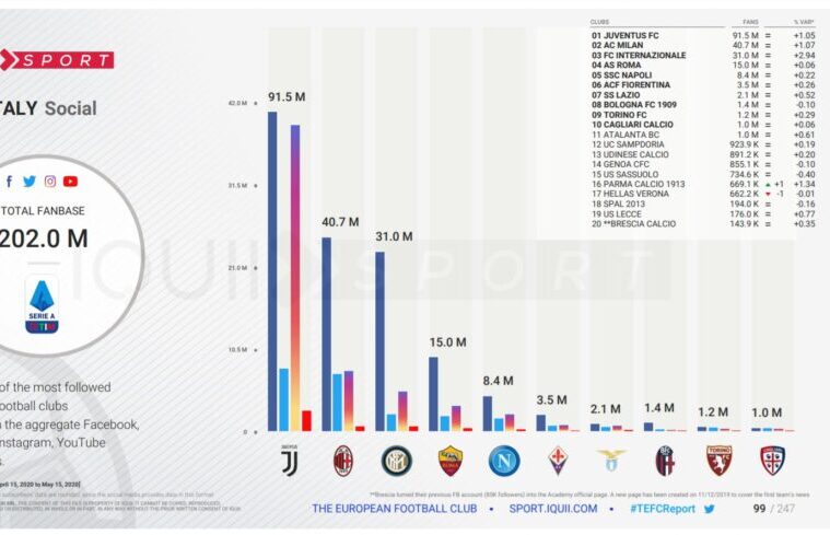 Lo studio ha preso in esame i maggiori campionati del continente, focalizzandosi in maniera particolare sulla Premier League, la Liga, la Ligue 1, la Bundesliga e la Serie A. A livello di fanbase globale la parte del leone la fanno il brand della Premier League (526 milioni) e della Liga (525 milioni, trainata da Barcellona e Real Madrid che hanno un peso superiore all’80% nella valutazione), seguita dalla Serie A italiana (202 milioni), dalla Bundesliga e dalla Ligue 1. Addentrandoci sull’analisi del nostro campionato domina le classifiche la Juventus con 91,5 milioni di follower nelle quattro piattaforme social principali (Facebook, Twitter, Instagram e YouTube) che la fanno balzare al quinto posto in Europa dopo Barcellona, Real Madrid, Liverpool e Manchester United: appena fuori dalla Top10 continentale le altre due italiane Milan (40,7 milioni) e Inter (31 Milioni), seguita dalla Roma sedicesima nello scenario europeo con 15 milioni di follower.