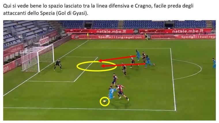 2) Sui cross laterali, soprattutto se provenienti dal lato corto dell’area, la distanza tra portiere e linea della difesa è eccessiva e questo consente agli avversari di infilarsi e segnare agevolmente (ad esempio contro Spezia e Lazio coi gol di Gyasi e Lazzari). Sarebbe opportuno coprire quella zona per poter attaccare la palla e non dover rinculare, rischiando di lasciare spazio o addirittura l’autogol.