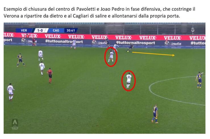 LA FASE DI NON POSSESSO – In fase di non possesso è tutta la squadra a muoversi con grande spirito di sacrificio ed avendo ben chiari i principi fondamentali, su cui il loro allenatore lavora molto e bene. La partecipazione immediata da parte di tutti i giocatori, fin dai primi momenti in cui l’avversario entra in possesso della palla, permette di reagire prontamente (infatti recuperano molti palloni entro i primi cinque secondi) e di farsi trovare raramente esposti (mi vengono in mente solo il gol di Muriel contro l’Atalanta e in parte quello di Zaccagni contro il Verona). I primi difensori sono Pavoletti e Joao Pedro che provano a pressare e in ogni caso a chiudere la zona centrale per schermare il centrocampista che va a ricevere palla e obbligare gli avversari a ripartire da dietro.