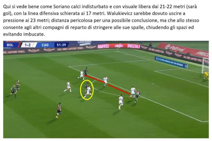 1) La difesa spesso continua a scappare anche all’interno degli ultimi 23 metri, schiacciandosi troppo verso la propria porta. Così facendo consente al portatore di avvicinarsi troppo alla “red zone” e poter calciare da posizione pericolosa (vedi i gol subiti da Soriano, Barrow e Gomez).