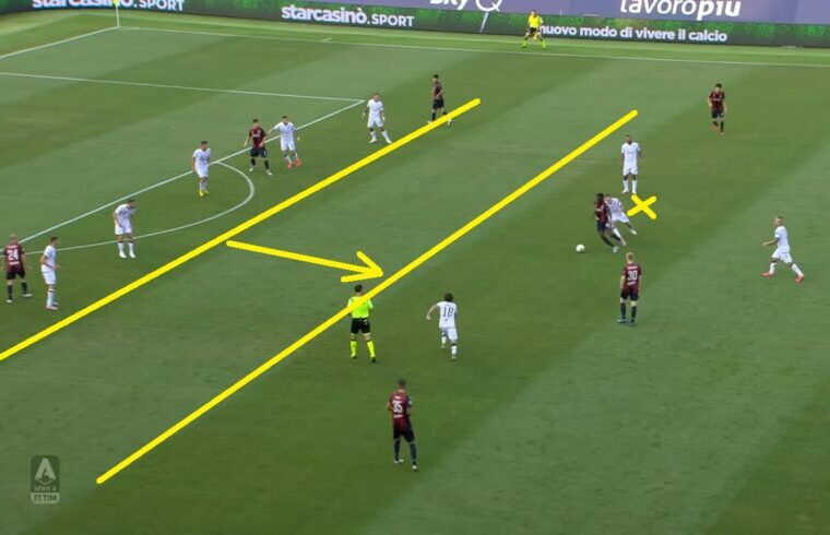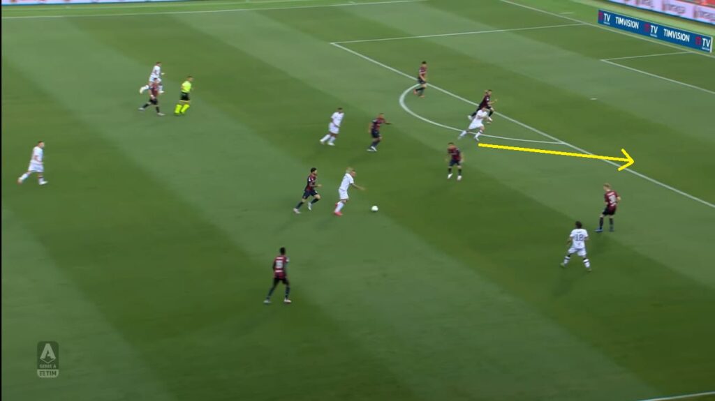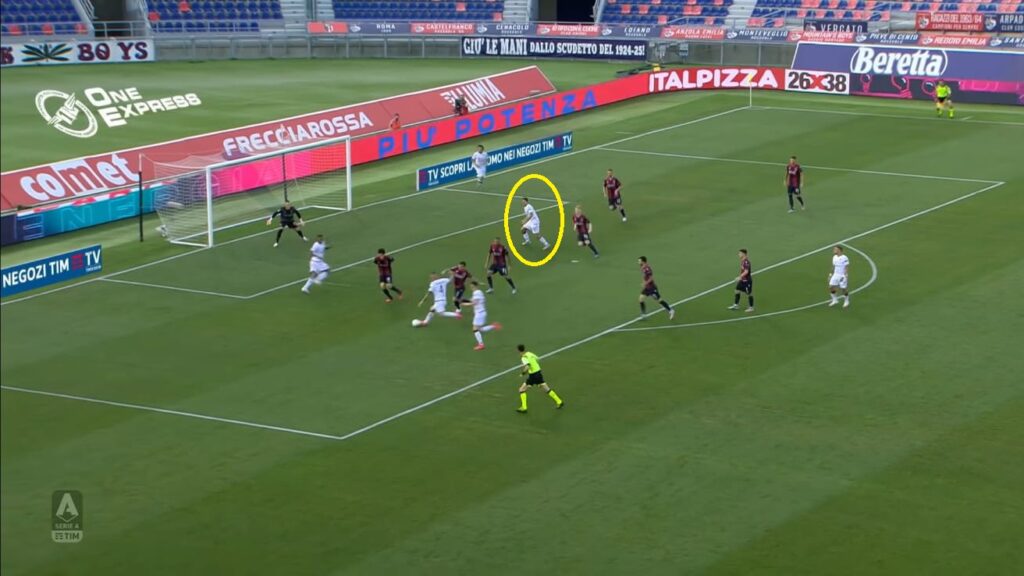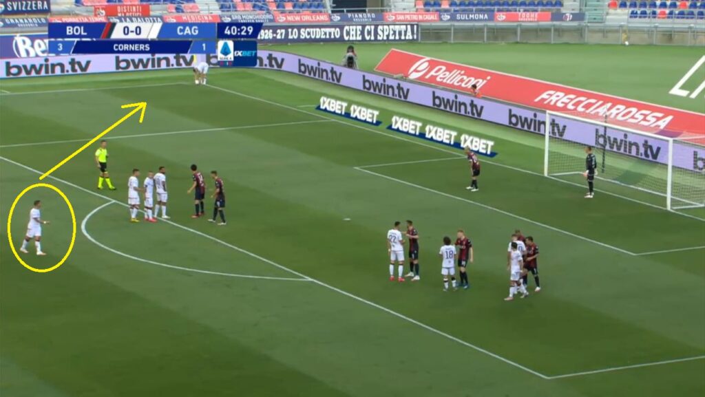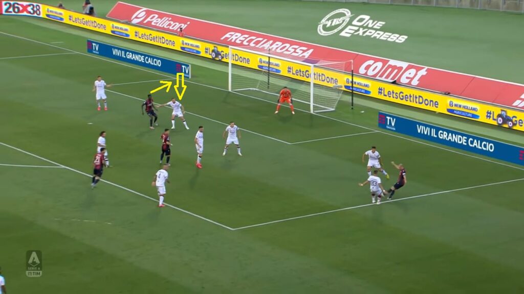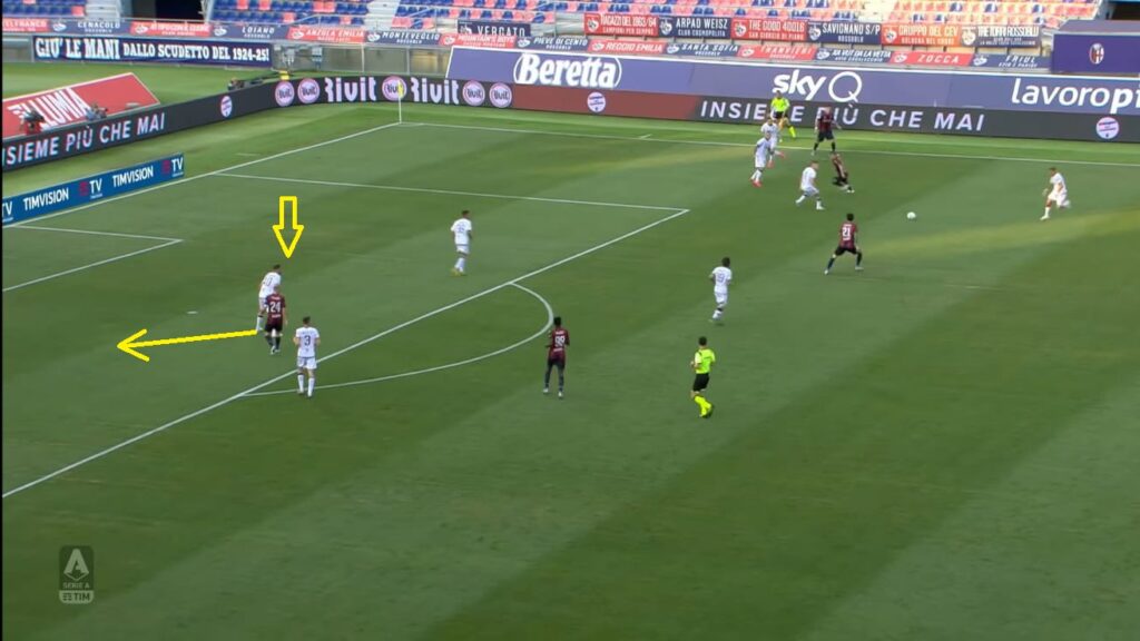 A Bologna perรฒ finalmente il primo riscontro di quel “caos organizzato” che ha reso famoso Gianni Vio in Italia e all’estero. Nel finale della prima frazione, infatti, il Cagliari ha creato una situazione sprecata poi da Joao Pedro, uno schema interessante che ha messo in confusione la difesa del Bologna. Due “treni” appena dentro l’area in linea con i due pali della porta avversaria, la creazione di un vuoto nel centro dei sedici metri (grazie anche allo schieramento a uomo del Bologna), un giocatore – Pellegrini – leggermente staccato che finge di disinteressarsi del gioco per poi andare a ricevere corto il pallone.