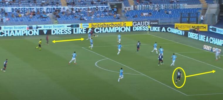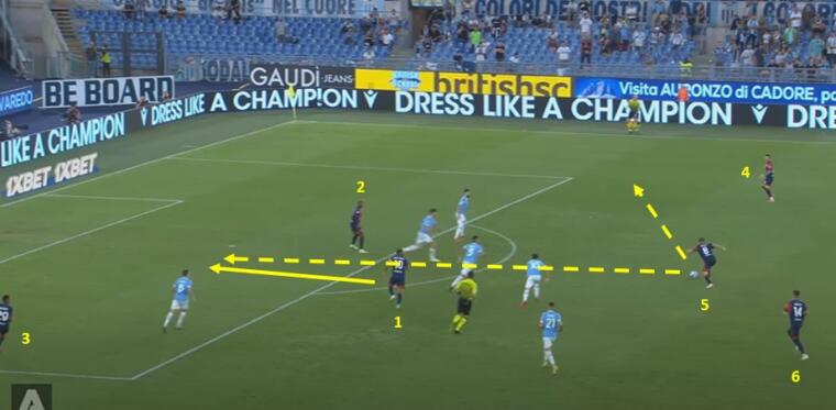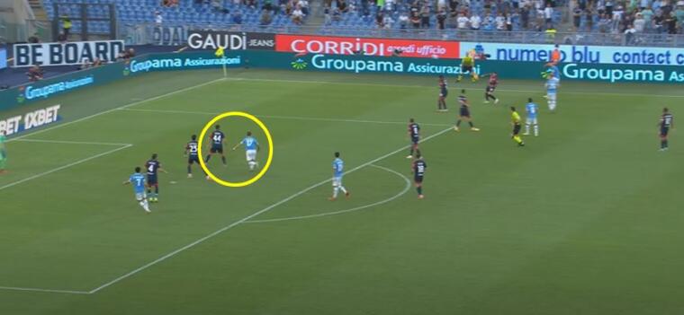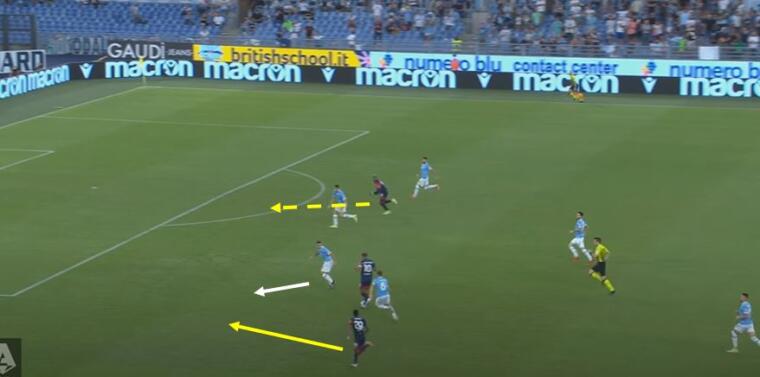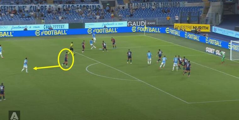 Non solo in fase difensiva, ma anche in fase offensiva la disposizione ha permesso a Dalbert e Nández di essere più liberi. Coperti da Lykogiannis e Caceres, i due esterni di centrocampo hanno disputato una gara di alto livello tenendo abbastanza bassi sia Lazzari che Hysaj. Sulla destra Caceres giocava più contenuto in difesa, sulla sinistra i due rossoblù si alternavano invece con maggiore continuità. Un esempio l’occasione di Nández con il colpo di testa da ottima posizione finito alto. Il cross è di Lykogiannis, mentre Dalbert copriva la discesa del compagno. Sul lato opposto il León è abile invece a chiudere l’azione con un inserimento perfetto. In mezzo all’area Joao Pedro e Keita si dividono lo spazio, uno più vicino alla zona di possesso e l’altro più centrale.