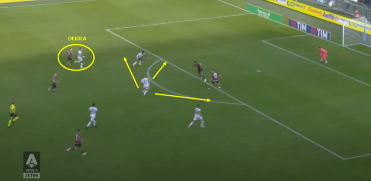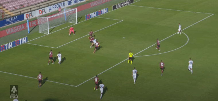 Prima ancora che l’uzbeko controlli il pallone รจ la postura dei compagni a fare la differenza tra un’azione potenziale e un’occasione reale. Ogni giocatore rossoblรน ha il corpo diretto verso la porta di Costil, Viola e Jankto partono da fuori area per arrivare in prossimitร della porta con il primo che ha gioco facile nel depositare in rete di testa.