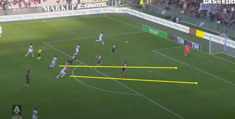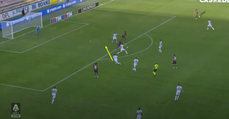 Quando la sfera arriva nella zona occupata dal difensore slovacco Augello si fida forse troppo del compagno e perde il controllo dell’avversario diretto, venendo cosรฌ punito dallo scivolone di Obert che permette aย Tchaounaย di completare il triangolo con Dia, nel frattempo andato ad attaccare lo spazio alle spalle del centrale classe 2002. Goldaniga, dal canto suo, tenta un recupero disperato, ma non appena capisce l’impossibilitร di chiudere sul centravanti senegalese prova a fare un passo in avanti per metterlo in fuorigioco. Augello, perรฒ, รจ giustamente piรน basso dopo la diagonale precedente e tiene in gioco il numero 10 della Salernitana.