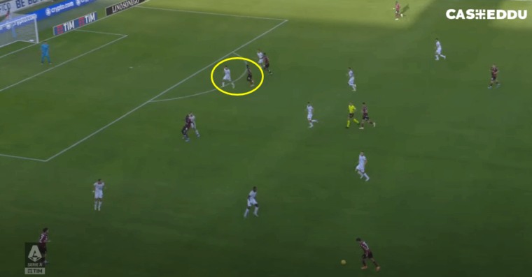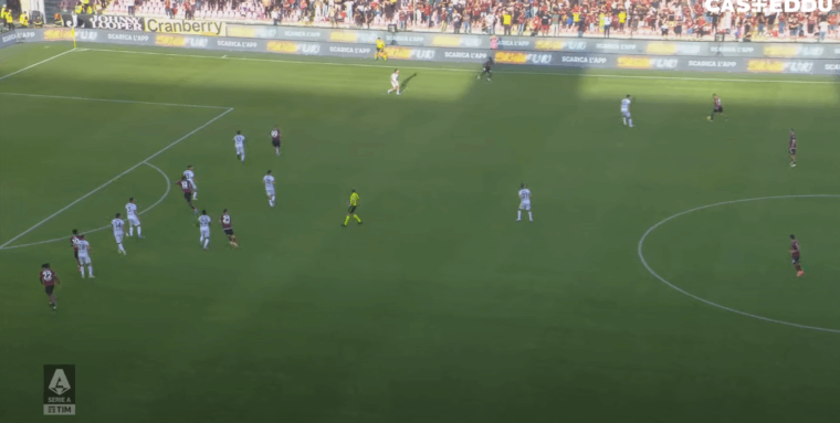 Oltre alla giocata del ceco nel servireย Shomurodovย – visione periferica – รจ importante notare la posizione di partenza di tutti i giocatori del Cagliari impegnati nella fase offensiva a maggior ragione considerando la rete appena subita che normalmente porta a paura e poca propensione all’attacco. Zappa sulla destra, Viola e Makoumbou centrali, Jankto come seconda punta e Shomurodov come prima: tutti pronti ad attaccare l’area di rigore della Salernitana.