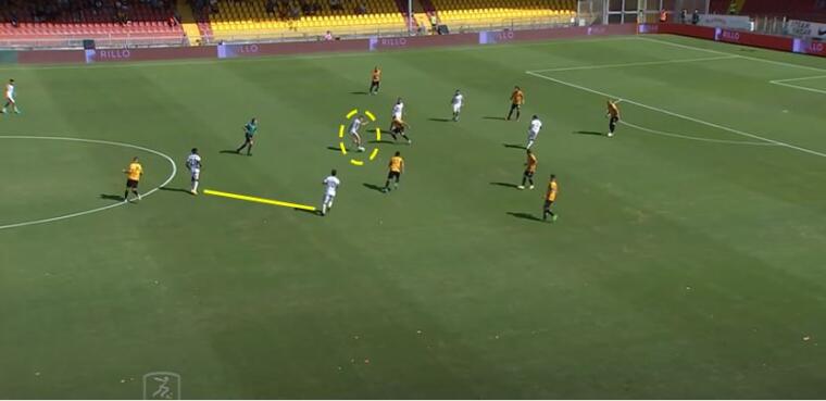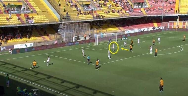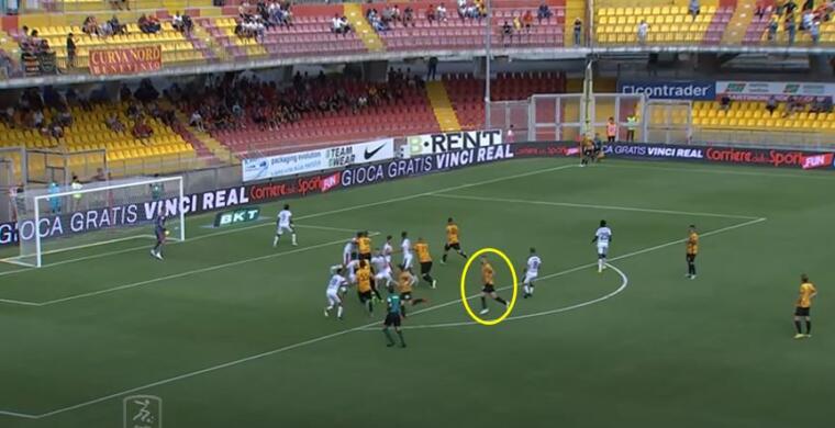 Un’altra criticità che si ripete da inizio stagione è quella dei palloni tagliati dentro l’area in orizzontale. Il duo Goldaniga-Altare entra in difficoltà nel coordinarsi, soprattutto l’ex Olbia è spesso attratto dalla sfera perdendo di vista il contatto con l’avversario diretto. Quando Forte riceve il cross dalla sinistra, infatti, trova fin troppo spazio tra i due centrali, con Altare che né attacca con decisione la sfera né si concentra sul centravanti del Benevento.