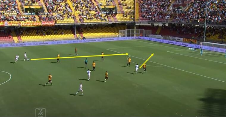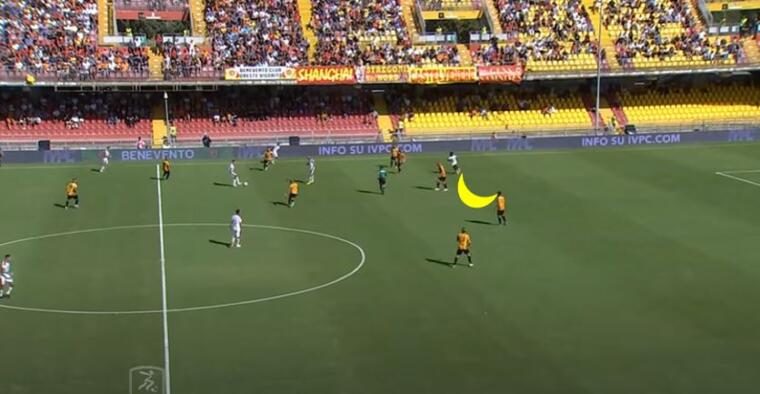 Il gol arriva esattamente grazie ai primi tre fattori descritti. Rog subisce fallo a metà campo – bravo Aureliano a lasciar proseguire – e poi prova la sovrapposizione alla sinistra di Mancosu. Il numero 5, dal canto suo, alza la testa in attesa di capire quale giocata provare, se allargare sul lato destro oppure assecondare l’eventuale movimento di Lapadula. Movimento che arriva con l’attacco dello spazio tra i due centrali di difesa del Benevento e con il gol che viene favorito anche dal pallone smorzato da Capellini nel tentativo di chiusura.