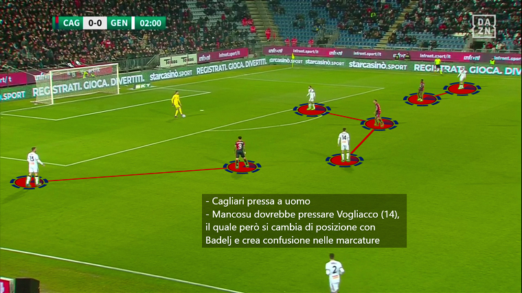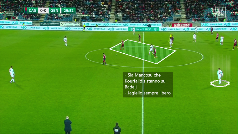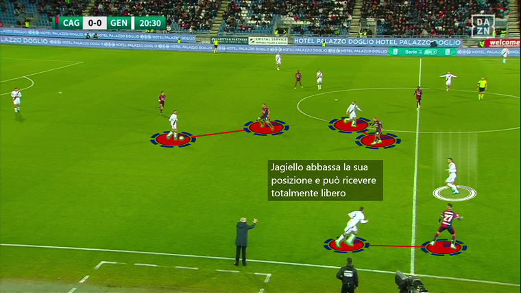 Quella tra i due tecnici è stata una vera e propria partita a scacchi e ad avere la meglio nella prima mezz’ora – come confermato dallo stesso Ranieri – è stato l’allenatore genoano. Gli ospiti costruivano con una struttura 3+2, il Cagliari come di consueto pressava a uomo. Tuttavia, il regista e capitano del Genoa Badelj si abbassava costantemente sulla linea dei difensori, creando confusione a Mancosu e Kourfalidis che non riuscivano a capire chi dovesse andare su di lui e chi dovesse andare sul centrale Vogliacco. In aggiunta a questo problema, il trequartista che stazionava sul centrodestra, Jagiello, abbassava sempre di tantissimi metri la sua posizione, fino a diventare un vero e proprio centrocampista aggiunto. Teoricamente spettava ad Altare alzarsi su di lui, ma l’ex Olbia – salvo alcuni momenti a inizio gara – non si sentiva a suo agio nell’allontanarsi così tanto dalla linea difensiva. La squadra di Gilardino aveva quindi costante superiorità numerica a centrocampo, e da una di queste situazioni è riuscita a creare la più grande palla gol del primo tempo con Puscas dentro l’area.