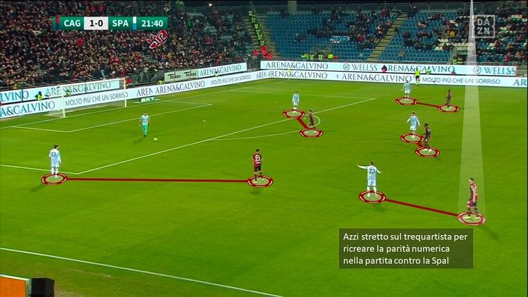 Se torniamo indietro nel tempo alla partita contro la Spal, anche De Rossi giocava con lo stesso modulo e aveva provato la stessa identica strategia. In quel caso Ranieri aveva trovato una soluzione chiedendo ad Azzi (titolare sulla fascia sinistra) di stringere la posizione per ritrovare la parità numerica centralmente.