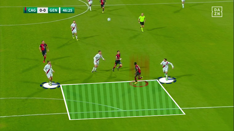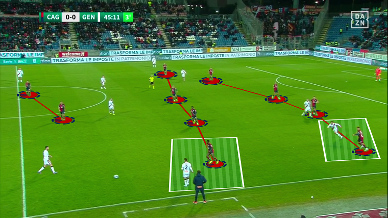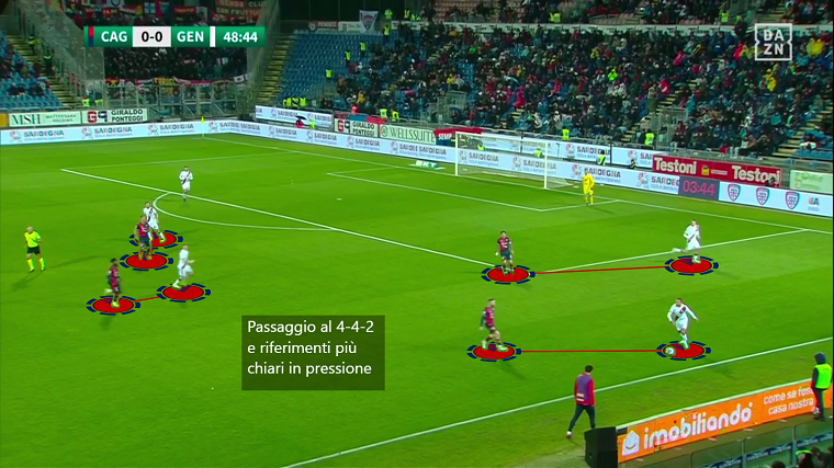 Ranieri ha messo una pezza già alla fine del primo tempo, anticipando il 4-4-2 della ripresa con lo spostamento di Luvumbo a sinistra per tenere Sabelli, in modo che Barreca potesse stare su Jagiello. Il cambio nell’intervallo (Nández per Goldaniga) andava proprio in questa direzione: ritornare al modulo delle settimane precedenti che così bene aveva gestito la potenziale superiorità numerica a centrocampo di Bari e Venezia. Curiosamente, anche Gilardino ha fatto un cambio simile togliendo un centrale e aggiungendo un centrocampista per tornare a quattro dietro. Se nel primo tempo la partita a scacchi la stava vincendo l’ex attaccante del Milan, nel secondo tempo Ranieri l’ha assolutamente ribaltata. Il passaggio al 4-4-2 ha semplificato i riferimenti a uomo rendendo più efficace la pressione del Cagliari, così come il passaggio a 4 del Genoa e lo spostamento a sinistra di Luvumbo ha permesso ai rossoblù di trovare costantemente in profondità l’angolo nello spazio tra terzino destro e centrale degli ospiti, come avvenuto al 48’ e al 51’.