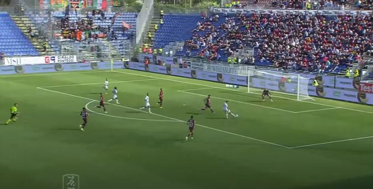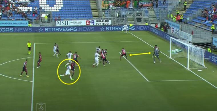 Corner che nasce da un errore clamoroso di Zappa ed è proprio il terzino ex Pescara a farsi sorprendere dal finlandese nel successivo cross dalla bandierina. I rossoblù, schierati a zona mista – uomo su uomo più due uomini liberi per attaccare la sfera – mostrano un mismatch fisico evidente. L’accoppiamento Zappa-Pohjanpalo non dei migliori – eufemismo – ma a sorprendere è che in una squadra con pochi saltatori, a restare liberi da compiti di marcatura sono due tra gli elementi più fisici del gruppo. Pavoletti e Makoumbou, infatti, coprono la zona del primo palo, mentre uno degli avversari più pericolosi è seguito da uno dei saltatori più deficitari tra i rossoblù.