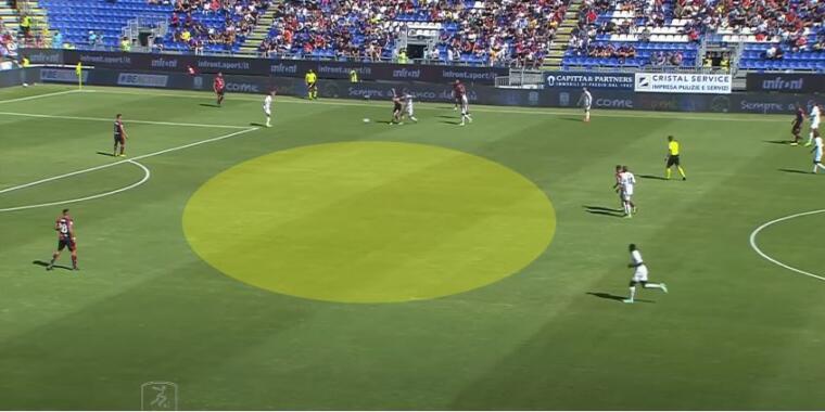 A chiudere il cerchio dei problemi alla voce sviluppo del gioco, una delle prime occasioni capitate al Venezia racconta tanto delle scelte di Liverani che li hanno determinati. Rog viene pressato sul lato sinistro della difesa rossoblù, in mezzo al campo l’ampio spazio non vede nessun centrocampista del Cagliari farsi trovare libero per aiutare il compagno nello sviluppo della manovra. E qui entra in gioco la decisione di schierare una mediana con il solo croato capace di giocare il pallone, mentre Deiola e Nández sono risultati incapaci di dare manforte alla costruzione come da loro caratteristiche. Con l’idea di fare possesso, non avere in campo contemporaneamente né Makoumbou né Viola – oltre ad aver scelto come interno il León e non Mancosu – ha permesso al Venezia di avere vita facile nel controllare lo sviluppo dal basso dei rossoblù.