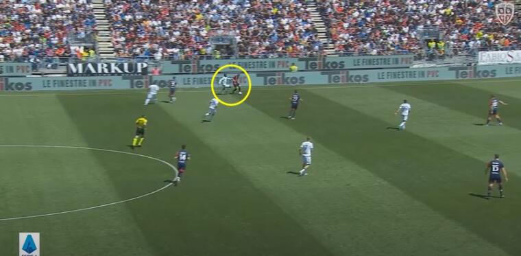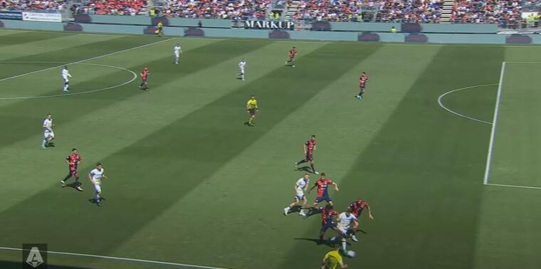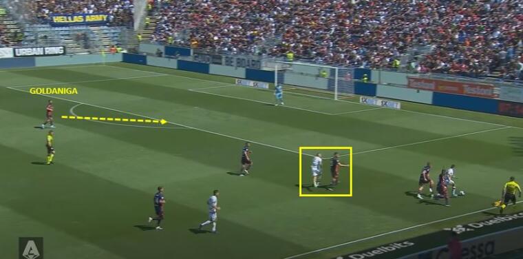 Quando Barak arriva davanti a Cragno si possono notare due dettagli. Il primo è il vantaggio accumulato dal ceco sia su Altare che su Grassi. Il secondo, che ha del surreale, è Goldaniga che con lo sguardo cerca Caprari fuori schermo nonostante Barak sia di fatto sul punto di calciare a pochi metri dalla porta rossoblù. Un aspetto che potrebbe apparire secondario, ma che spiega l’essere completamente succubi di una filosofia a prescindere da ciò che accade in campo.