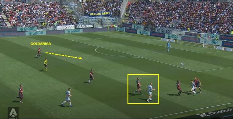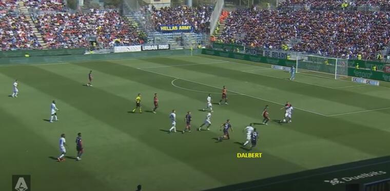 La premessa è che l’avvio e la prestazione tutta del duo Lovato-Dalbert sono stati da incubo. Il gol di Barak ne è un esempio lampante, con quel pallone conteso a Simeone che non viene liberato. Altare, dal canto suo, è proprio su Barak, altissimo ma con parecchio spazio da coprire per evitare l’attacco dello spazio del giocatore ceco. Grassi può essere un supporto, ma sembra quasi disinteressarsi non essendo Barak il suo avversario diretto. Sul lato opposto Goldaniga dovrebbe accorciare e fare una diagonale abbastanza scolastica, ma il suo pensiero è Caprari – il suo uomo – e non la visione d’insieme.