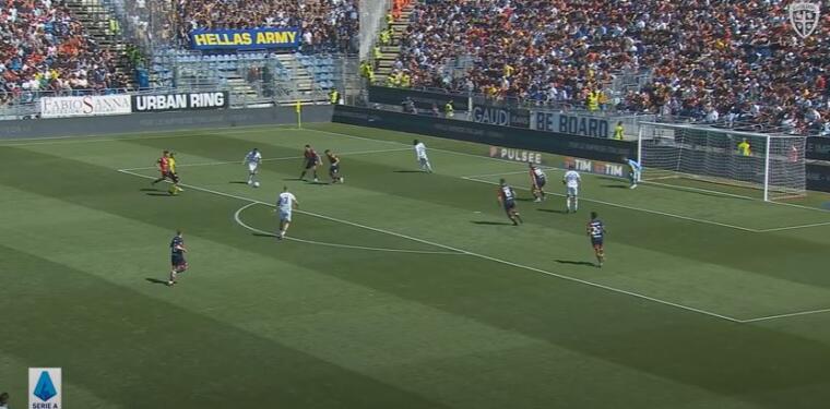 Il raddoppio del Verona arriva dopo l’unica vera azione sviluppata dal Cagliari. Prima di andare nel dettaglio della traversa di Keita, ecco la giocata del gol di Caprari. Il tutto parte da un lancio dalle retrovie a tagliare il campo da destra a sinistra, attaccando alle spalle la retroguardia alta – e uomo su uomo – dei rossoblù. Lovato tiene in gioco di mezzo metro Caprari, il resto è ancora una volta una gestione delle marcature senza possibilità di uscire dal copione pensato.