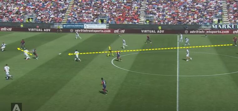 In mezzo a tanti lanci lunghi e a occasioni arrivate solo su azione di palla inattiva (Altare, Joao Pedro, il gol del capitano su punizione), l’unica giocata degna di nota del Cagliari ha portato alla traversa di Keita.