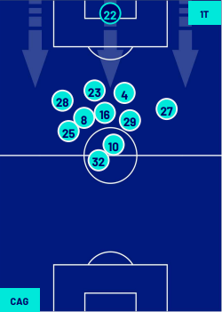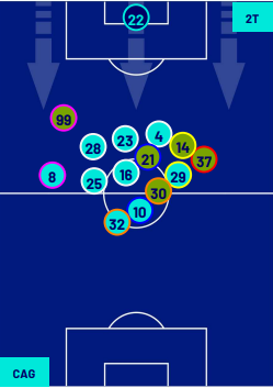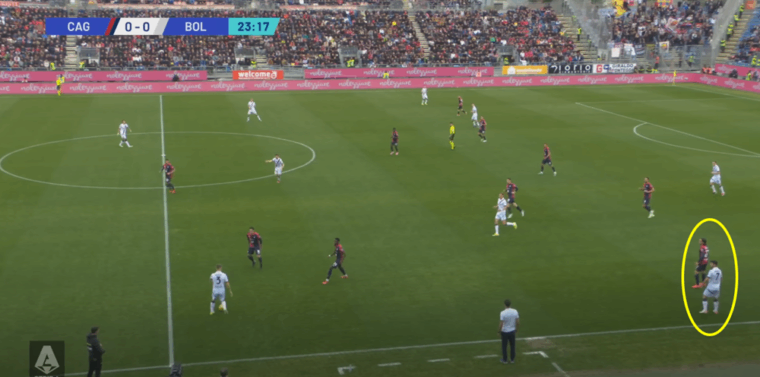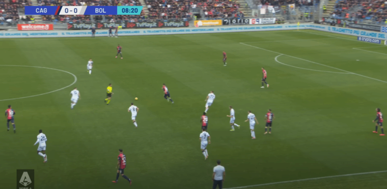 I primi 15 minuti hanno visto un Cagliari in difficoltà nel gestire gli inserimenti con e senza palla dei centrocampisti emiliani, con soprattutto lo spazio tra terzini e centrali sia a destra che a sinistra attaccato dai vari Ferguson, Freuler, Orsolini e Urbanski. Nell’immagine proposta, nonostante l’assenza di Wieteska momentaneamente a bordo campo, si possono notare il tentativo di compattezza da parte dei rossoblù e la posizione di Nández, spesso costretto al ripiegamento in aiuto della mediana e di Augello, mentre il Bologna provava ad attaccare lo spazio tra difesa e centrocampo per colpire nella zona centrale.
