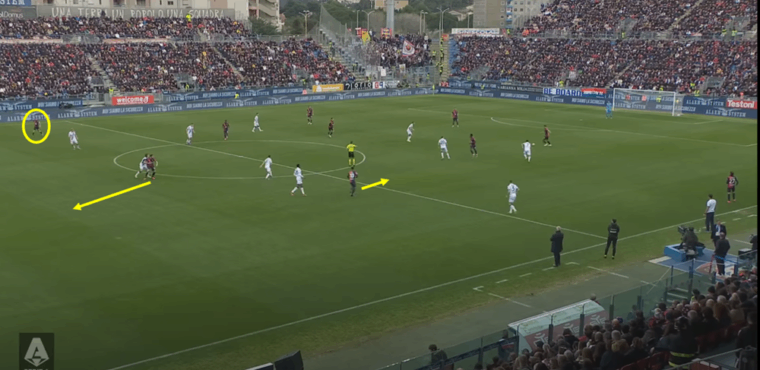 Un Cagliari che dopo la rete del pareggio si è sbloccato, il centrocampo ha iniziato a macinare chilometri con logica tattica e non senza costrutto, Viola è stato perfetto nello schermare le linee di passaggio dal basso. Soprattutto il cambio tra Augello e Azzi ha prodotto uno spostamento del baricentro, causa e conseguenza di un diverso atteggiamento tattico che non ha solo limitato Orsolini, ma creato i presupposti per maggiore presenza offensiva dalla mediana in su.