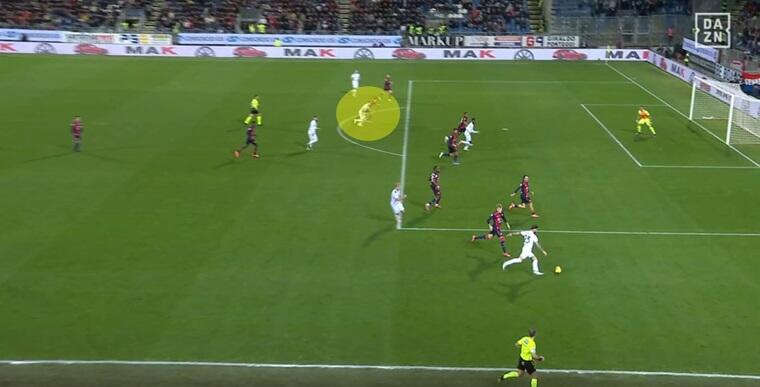 Sulla corsia destra è arrivata invece la novità alla quale si riferiva probabilmente Nicola nella conferenza prepartita. Non più la ricerca ossessiva delle combinazioni tra Zappa e Zortea, piuttosto il cercare di attaccare maggiormente la zona di rifinitura centrale andando a trovare Viola grazie a un movimento codificato. Quello che vedeva Zappa restare basso, Adopo andare ad allargarsi sull’esterno per aprire lo spazio e Zortea condurre palla centralmente in diagonale per attaccare la zona lasciata libera dal compagno, andando a cercare la combinazione proprio con Viola. Situazione che ha portato alla prima occasione della partita – la conclusione da fuori area del numero dieci – ma che non ha poi prodotto grandi pericoli alla porta di Provedel.