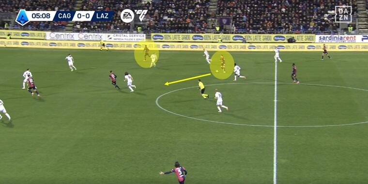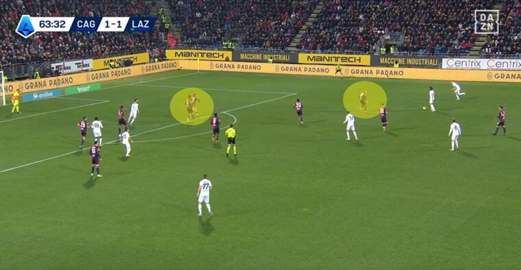 Una costante vista anche nelle precedenti partite è quella di Zappa come maggiore indiziato della retroguardia a svolgere compiti di rottura della linea. Ossia di una vera e propria marcatura a tutto campo dell’avversario diretto, non uno qualunque ma uno dalle qualità sia tecniche che tattiche qual è Zaccagni. Il terzino destro del Cagliari è stato letteralmente portato a spasso dal fantasista biancoceleste, arrivando perfino a farsi inseguire anche nel mezzo spazio opposto.