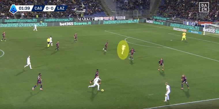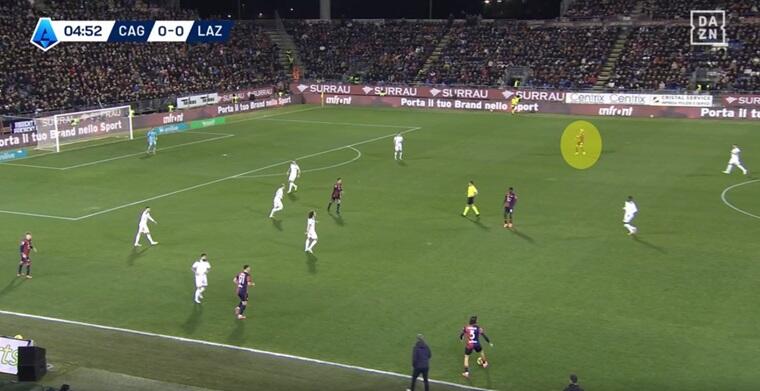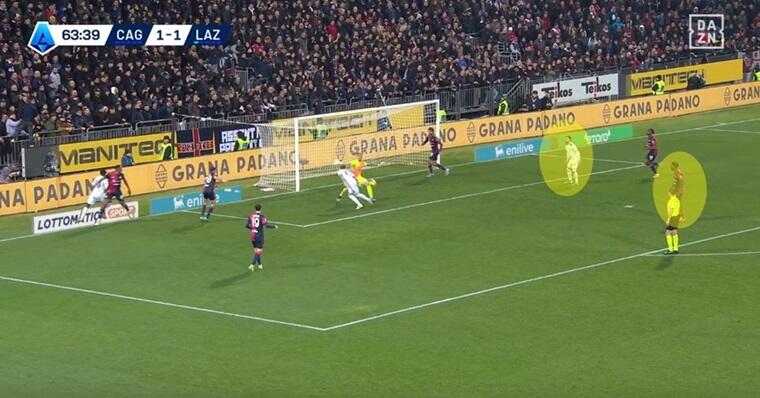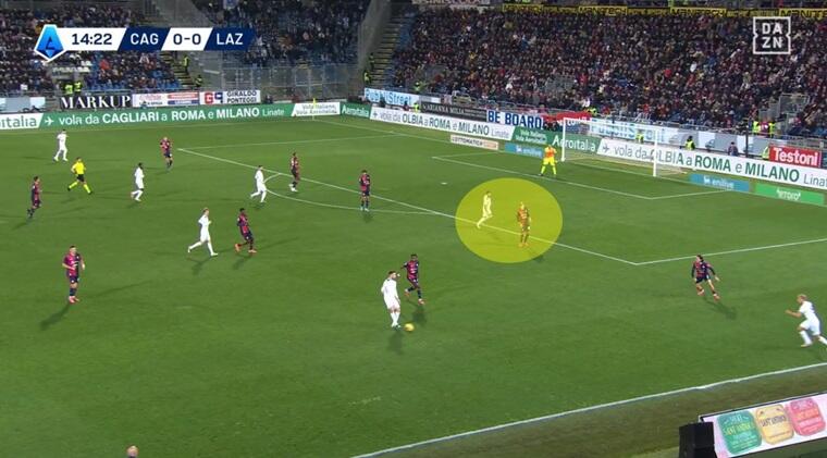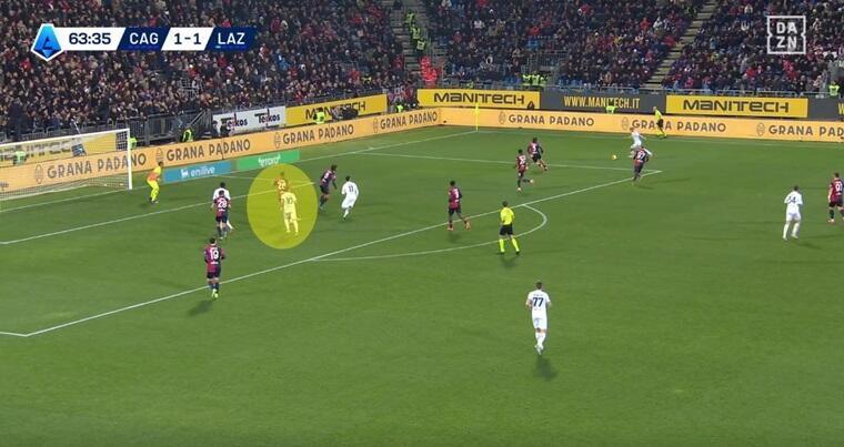 Eppure, nonostante il ritardo della catena di sinistra della difesa del Cagliari, nella zona centrale la situazione appare facilmente controllabile. Accoppiamenti automatici, nessuna inferiorità numerica, servirebbe in sostanza una giocata sopra le righe degli attaccanti della Lazio per portare al gol. Oppure un errore di valutazione di uno dei singoli che è, appunto, ciò che avviene.
