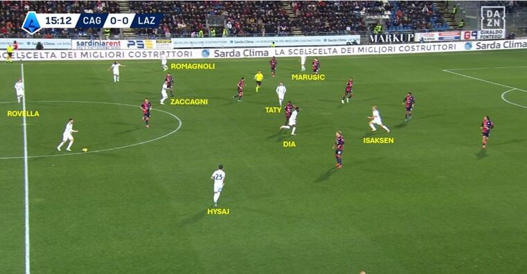 I biancocelesti di Baroni, che ha portato con il suo arrivo nella Capitale un calcio posizionale, hanno creato problemi al Cagliari con continue rotazioni degli interpreti. Dai centrali di difesa che non hanno disdegnato spostamenti in zona offensiva al duo Dia-Castellanos che si scambiava nel compito di proporsi tra le linee, passando per Zaccagni libero di muoversi nella zona di rifinitura fino ad arrivare a Rovella che sceglieva la posizione da prendere in regia a seconda della situazione di gioco. A creare però maggiori difficoltà alla squadra di Nicola è stata senza dubbio la posizione di Hysaj.