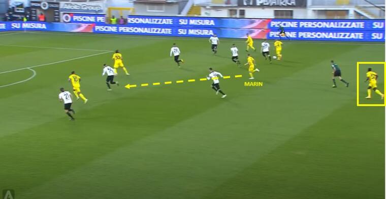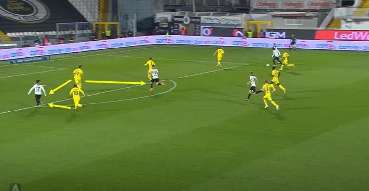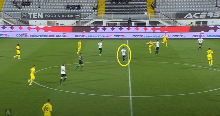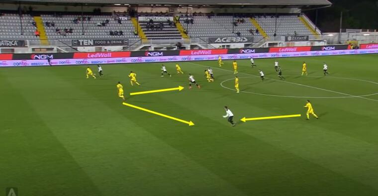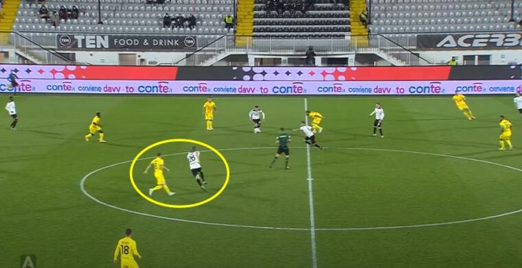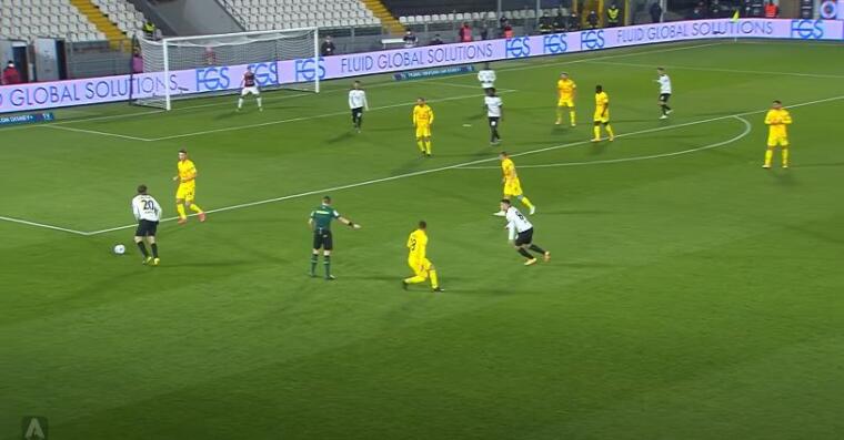 Nelle immagini proposte è evidente il ritardo di Nández nel coprire l’incursione di Farias sul lato opposto rispetto a Gyasi. Questo ritardo porta Rugani, centrale che dovrebbe occuparsi di Piccoli, a rimanere a metà tra il centravanti spezzino e l’esterno ex di giornata. Rugani si trova a dover effettuare una scelta tra porre maggiore attenzione su Farias o, al contrario, accorciare su Piccoli. Delle due il centrale rossoblù sceglie di rimanere a metà nella speranza di poter coprire all’occorrenza entrambi i pericoli avversari. Invece Piccoli resta libero di colpire e Cragno non può nulla sulla conclusione del centravanti.