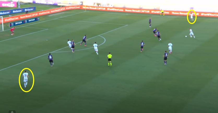 L’importanza dei cosiddetti quinti รจ evidente nell’occasione capitata a Nรกndez nella ripresa. Sia Mattiello che il Leรณn supportano il contropiede del Cagliari, partito da una verticale diretta che ha trovato Joao Pedro a metร campo e Nainggolan pronto a raccogliere la palla vagante per far partire la transizione offensiva. Il Ninja, arrivato quasi al limite dell’area, ha cosรฌ diverse opzioni: lo scarico su Mattiello, con possibile cross sul lato opposto per la chiusura in porta di Nรกndez, la palla verticale per Simeone o andare direttamente lui sul centrocampista uruguaiano saltando un passaggio.